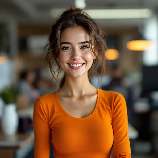 8 months ago photo of a beautiful young woman wearing an tight orange shirt, and smiling at the camera, photorealistic, hyper-detailed, shot on a Sony A7III, office background --ar 1:2 --stylize 750 ScrawnySmalls 0 39