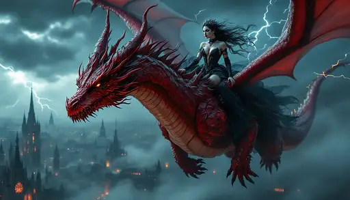 11 months ago A closeup of The Gothic queen with big breasts and natural black eyes wearing a provocative cleavage gothic gown. rides a red dragon. Her provocative gothic cleavage attire features black lace, leather accents, and shimmering silver details. The dragon’s scales glisten like molten lava, its wings spread wide as it soars through a stormy sky filled with dark clouds and streaks of lightning. Below them lies a sprawling gothic city with towering spires, glowing red windows, and swirling mist. Sensations 0 11