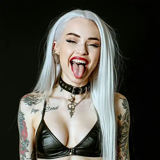 10 months ago Portrait of a gorgeous woman, 20 years old, with open lush large breasts, a thin leather bra, waist-length, with tattoos on her arms, long white hair, and a piercing gaze. The woman playfully sticks out her tongue and smiles. Long white hair frames an expressive face with clearly defined eyebrows and full lips. The skin is smooth, warm tone. The body is decorated with numerous tattoos, especially noticeable on the arms and chest. The neck is adorned with a black leather choker with metal elements. The background is dark, which creates a dramatic contrast. Directional lighting emphasizes facial features and sparkle in the eyes. The style of the photo is a glamorous portrait with elements of alternative aesthetics. Close-up, focus on the face and upper body. Seppi528 0 23