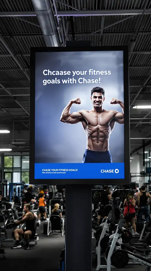 10 months ago A billboard that has a picture of a young man flexing his muscles with a slogan that says, chase your fitness goals with Chase! A gym with lots of machines and people in the background Seppi528 0 27