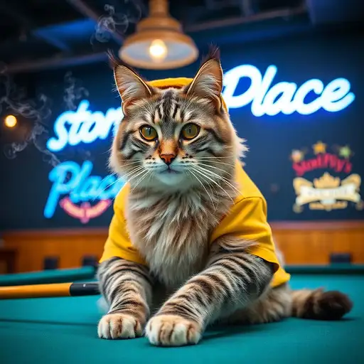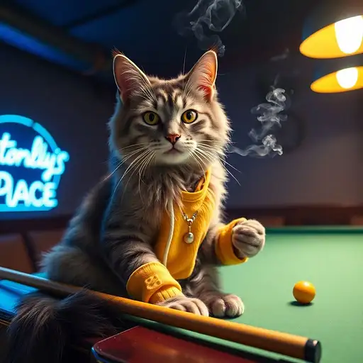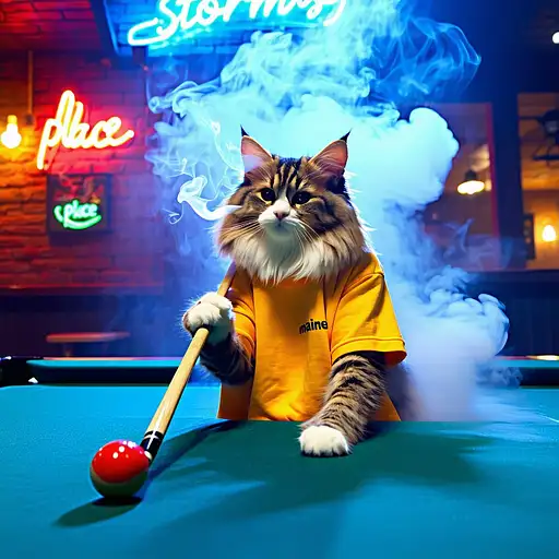 10 months ago Dramatic photo, visual tension, anthropomorphic real cute maine coon cat grey and white in color, wearing yellow casual wear, holding a pool cue, sitting on a pool table in a pool room, smoking and exhaling smoke, hyper detailed, UHD, ultrawide, with a blue neon sign that says stormys place in the background Seppi528 0 10