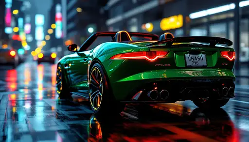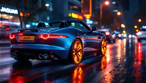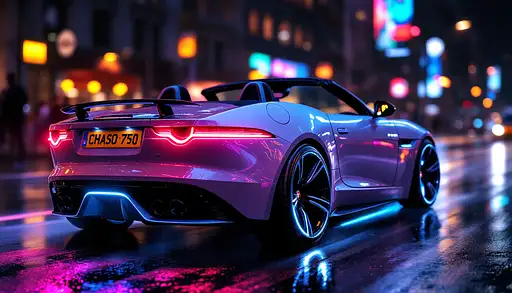 10 months ago A hyper-realistic close-up of the side view of a jaguar ftype convertible car with glowing wheels and lights, driving on wet streets at night, captured in high resolution, showcasing intricate details like reflections on its polished surface and neon lighting effects --ar 1:2 --stylize 750 Seppi528 0 20