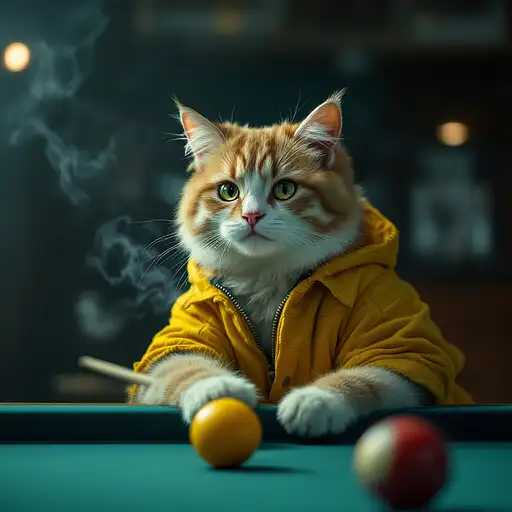10 months ago Dramatic photo, visual tension, anthropomorphic real cute cat, wearing yellow casual wear, holding a pool cue, sitting on a pool table in a pool room, smoking and exhaling smoke, hyper detailed, UHD, ultrawide Seppi528 0 30