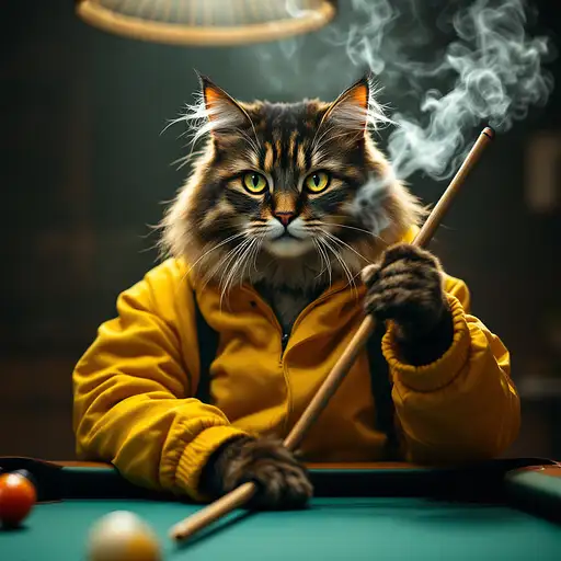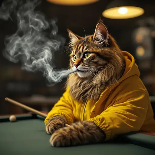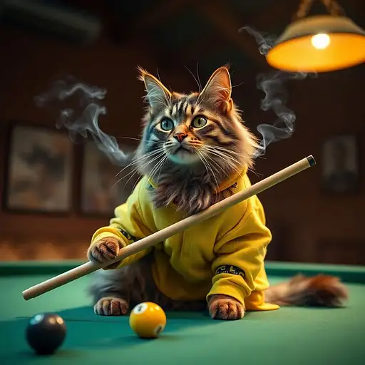 10 months ago Dramatic photo, visual tension, anthropomorphic real cute maine coon cat, wearing yellow casual wear, holding a pool cue, sitting on a pool table in a pool room, smoking and exhaling smoke, hyper detailed, UHD, ultrawide Seppi528 0 8