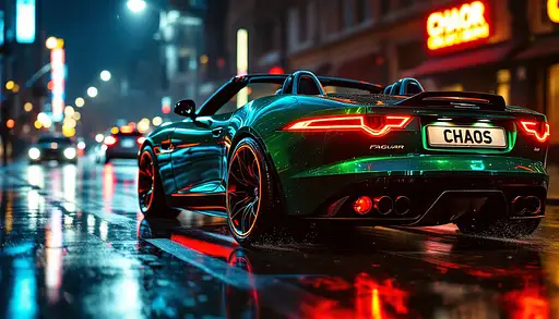 10 months ago A hyper-realistic close-up of the side view of a british racing green jaguar ftype convertible car with glowing wheels and lights, driving on wet streets at night, license plate says CHAOS, captured in high resolution, showcasing intricate details like reflections on its polished surface and neon lighting effects --ar 1:2 --stylize 750 Seppi528 0 15