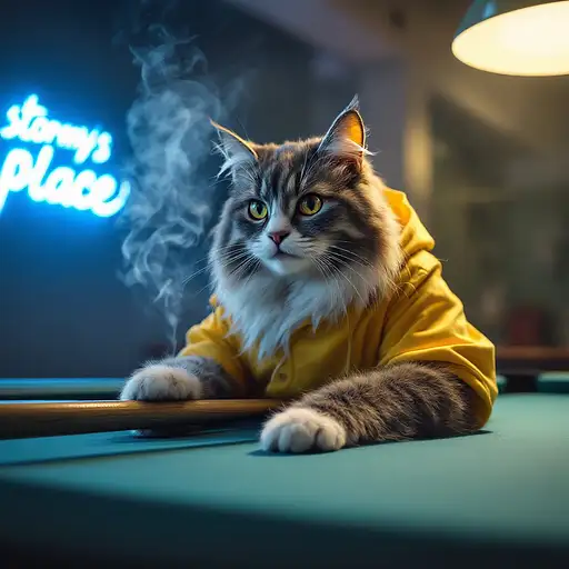 10 months ago Dramatic photo, visual tension, anthropomorphic real cute maine coon cat grey and white in color, wearing yellow casual wear, holding a pool cue, sitting on a pool table in a pool room, smoking and exhaling smoke, hyper detailed, UHD, ultrawide, with a blue neon sign that says stormys place in the background visible to the left Seppi528 0 12