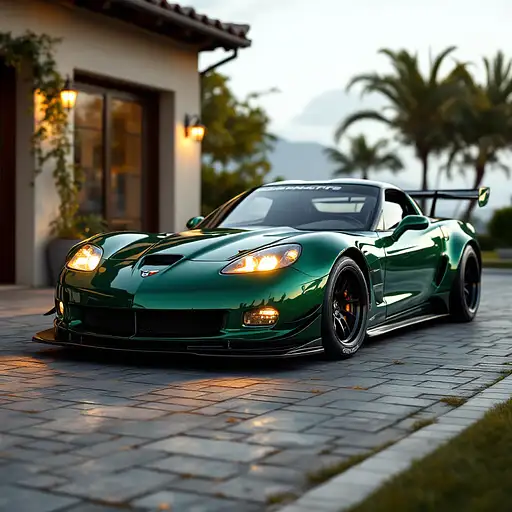 10 months ago General outline of a latest model British racing green 2000 corvette in road racer style, with glowing headlights, polished to a high shine, parked in a beach front driveway, bright atmosphere, artgerm, hygge, Seppi528 0 22