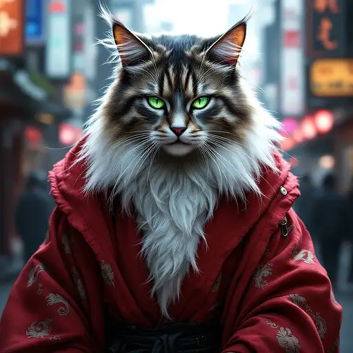 10 months ago a maine coon cat yakuza wearing futuristic scifi green eyes grey/white face and zen robes, hyper-realistic masterpiece, mystical cyberpunk city street Seppi528 0 14