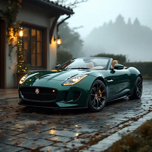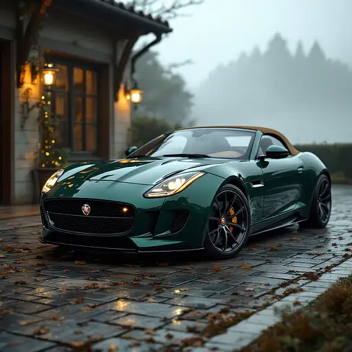10 months ago General outline of a latest model British racing green convertible jaguar ftype in steampunk style, with glowing headlights, polished to a high shine, parked in a beach front driveway, eerie atmosphere, fog, artgerm, hygge, Seppi528 1 24