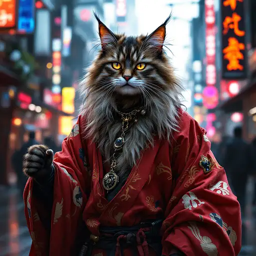10 months ago a maine coon cat yakuza wearing futuristic scifi and zen robes, hyper-realistic masterpiece, mystical cyberpunk city street Seppi528 0 9