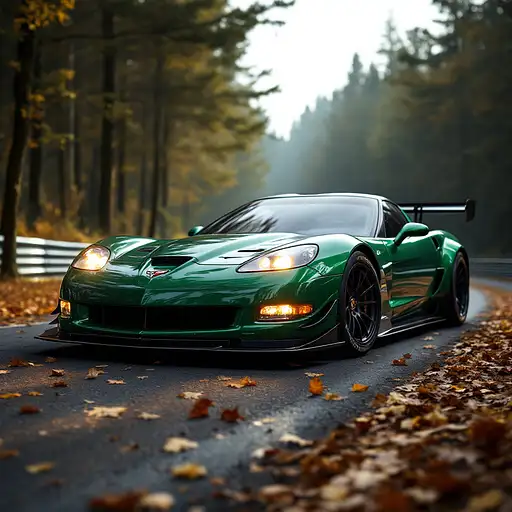 10 months ago General outline of a latest model British racing green 2000 corvette, with glowing headlights, polished to a high shine, parked on a wooded race track in germany, bright atmosphere, artgerm, hygge, Seppi528 0 30
