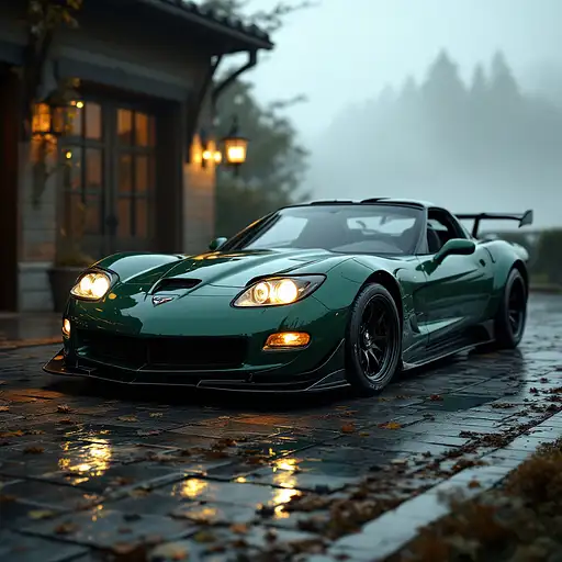 10 months ago General outline of a latest model British racing green 2000 corvette in steampunk style, with glowing headlights, polished to a high shine, parked in a beach front driveway, eerie atmosphere, fog, artgerm, hygge, Seppi528 0 13