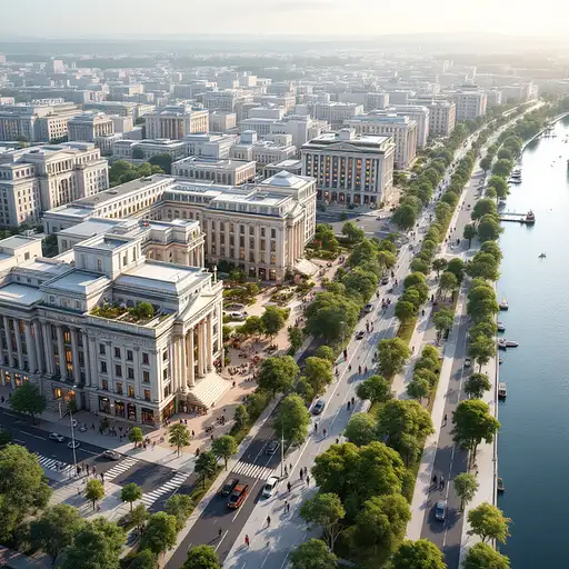 "Beautifully presented urban master plan, covering 50 hectares, designed along a scenic riverfront. The city layout includes three large business centers, eight residential complexes (7-8 stories), a modern school, and a vibrant kindergarten — all designed in an elegant classical architectural style with grand facades, decorative columns, intricate detailing, and symmetrical layouts. A spacious park for relaxation is integrated with green spaces, water features, and pedestrian-friendly streets. The area includes diverse retail stores and leisure zones, all maintaining the classical aesthetic. The design embraces the river, incorporating waterfront promenades, bridges, and recreational areas with stunning views. The city is full of life, with many people walking, socializing, shopping, cycling, and enjoying outdoor activities. Families in parks, professionals near business centers, children playing, and a dynamic urban environment. Wide, modern streets with well-designed sidewalks, dedicated bike lanes, and smoothly flowing traffic with cars, buses, and electric vehicles. Public transportation stops, pedestrian crossings, green medians, and urban street furniture enhance the infrastructure. Smart city elements such as eco-friendly lighting, digital billboards, and urban art installations, all harmonized with the classical design aesthetic. High-detail textures, ambient lighting, and a premium architectural presentation style. Isometric view, ultra-HD, photorealistic, highly detailed, neoclassical urban design --v 5 --ar 16:9 --q 2 --style 4b"