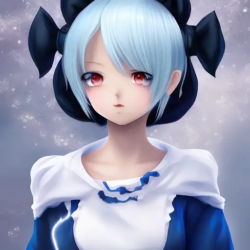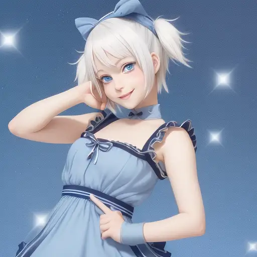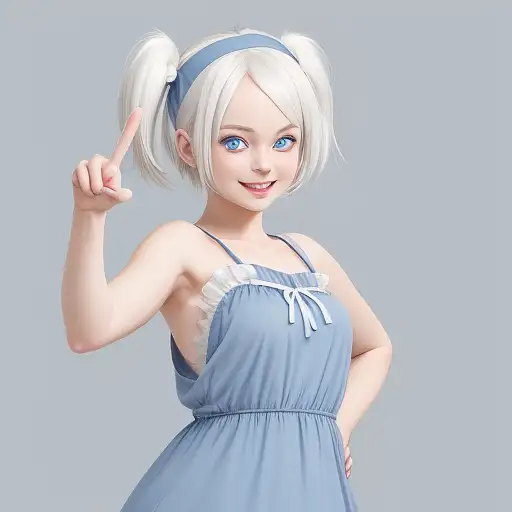 over 1 year ago Candid shot, an anime character, 1 girl, cute and soft, white hair, short hair with long twin tails, blue eyes, sparkling eyes, extremely detail quality, looking at viewers, wearing blue headband, wearing blue dress, full body, smiling and wink, simple background ShiroNyanko 1 120
