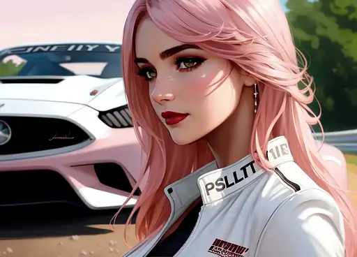 beautiful racecar woman standing beside a race car, tanned skin, (blush) (bangs), long hair, (freckles:0.75), detailed symmetrical face, smile, ((pink hair:1.4)), (straight hair), (green eyes:1.3), reflective eyes, dark eyebrows, mascara, makeup, (red lipstick), (white sclera),