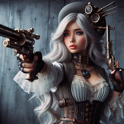 almost 2 years ago Very beautiful Steampunk lady, long silver hair, steampunk outfit and weapon, hyperrealism, photorealistic, 8k, unreal engine --ar 9:16 --niji 5 --style expressive --s 400 Sinarezaei 2 130