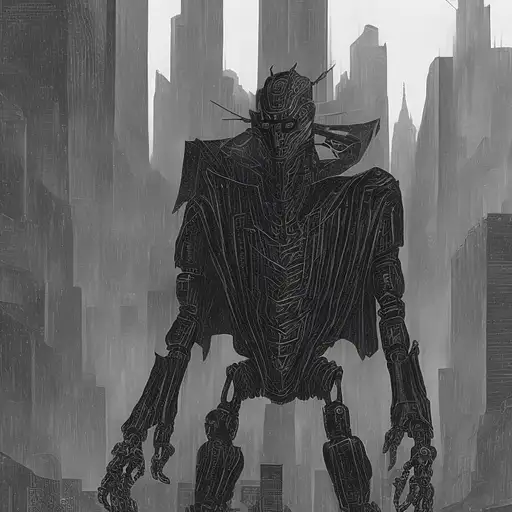 almost 2 years ago a robot wearing a cape and coat is standing in a city, in the style of dark black and gray, precisionist style, changelingcore, detailed facial features, ricoh r1, made of insects, destructive --ar 24:29 --q 2 Sinarezaei 0 64