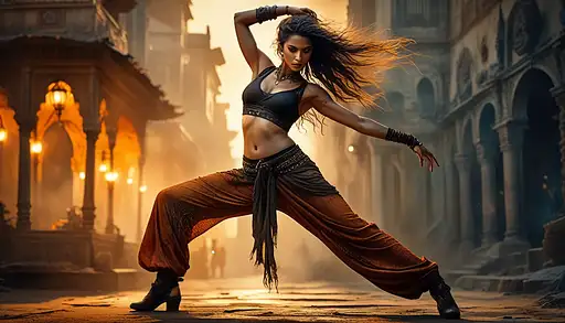 26 days ago Beautiful young exotic gypsy dancing in a rusted neon crinkled ink and watercolor wash illustration, harem pants, warm triadic color, golden hour, bokeh, by Andreas Lie :: Luis Royo :: HR Giger :: Greg Olsen SiobhacAI 0 22