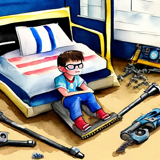 1 year ago Children's book style illustration, watercolor technique, a little boy wearing round glasses, dark blue shorts and pale blue striped shirt, he is in a bedroom, a seven year old child's bedroom, he is sitting on the floor and A robot is being built, various tools such as wrenches, wires, bolts and nuts are scattered around him on the ground. He is happy and smiling. soheil 0 44