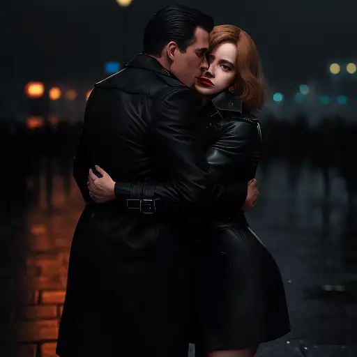 1 year ago A detective man who wears a light classic long trench coat that hugs a woman who wears a black leather trench with a short black leather skirt, the background is night and a dark city with red neon, weather is raining soheil 0 47