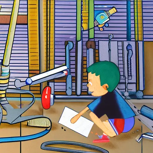 1 year ago Children's book style illustration, watercolor technique, a little boy wearing round glasses, dark blue shorts and pale blue striped shirt, he is in a bedroom, a seven year old child's bedroom, he is sitting on the floor and A robot is being built, various tools such as wrenches, wires, bolts and nuts are scattered around him on the ground. He is happy and smiling. soheil 0 53