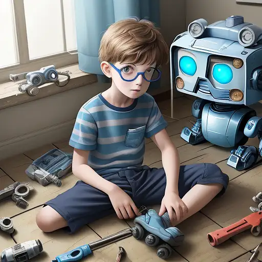1 year ago Children's book style illustration, watercolor technique on cardboard, a little boy wearing round glasses, dark blue shorts and pale blue striped shirt, he is in a bedroom, a seven year old child's bedroom, he is sitting on the floor and A robot is being built, various tools such as wrenches, wires, bolts and nuts are scattered around him on the ground. He is happy and smiling. soheil 0 41