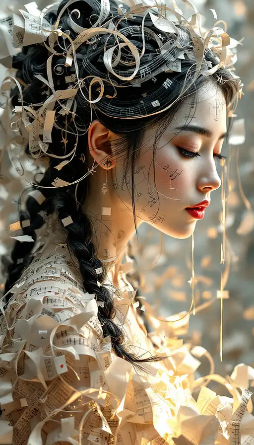 10 months ago Super detailed high-quality 8K An elaborate abstract collage made entirely of finely shredded and coiled photos, lace, paper, and sheet music. While seemingly random, the collage reveals a graceful woman with a serene gaze in an abstract space. The woman is of Asian descent, looking down towards a soft pool of light at her feet. The woman's face and body are constructed entirely of thousands of shredded strips of paper and lace, creating delicate patterns across her form. She has long, braided hair that spirals around her figure. The skin is comprised of translucent layers of paper, creating a delicate, ethereal look. Twist and coil the paper to create a 3D sculpture of a woman. Volumetric light illuminates her form, casting soft shadows. Use delicate, pastel colors to emphasize the woman. The shredded pieces of paper and lace show diverse patterns and textures that when combined build a highly detailed new image. The background environment is an abstract, minimal space with subtle hints of musical notation, complementing the woman's presence. Show fine details with narrow strips of photos and paper. Use text and musical notes to build the environment. Create depth with the varying background layers. Cinematic, depth of field, beautiful, epic, dynamic, abstract and energy. Sombrero 0 18