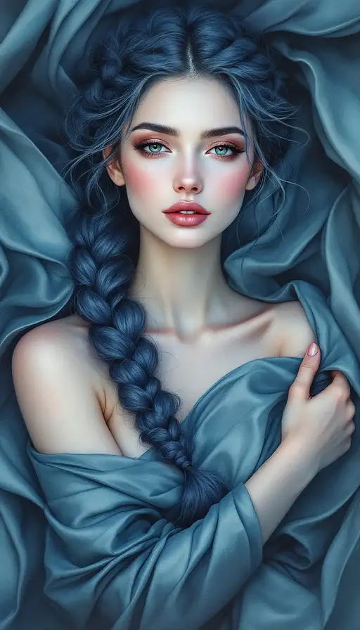 10 months ago A mesmerizing watercolor painting of a graceful and sensual woman with a long, elegant, dark blue braid that cascades down her back, the entire figure of the woman is visible, and she looks directly and peacefully, with her bare arms wrapped in flowing, deep teal silk. Her calm eyes, full of serenity and wisdom, draw the viewer in. The makeup is subtly applied, enhancing her natural features and glow. The colors are serene and muted. A watercolor masterpiece in the style of Greg Rutovsky, Nicoletta Dececcoli and Brian M Viveros, depicting an intricately detailed woman. calm colors, peaceful atmosphere, abstract artistic background, ethereal, dreamy, perfect composition, photo, illustration, poster. Sombrero 0 22
