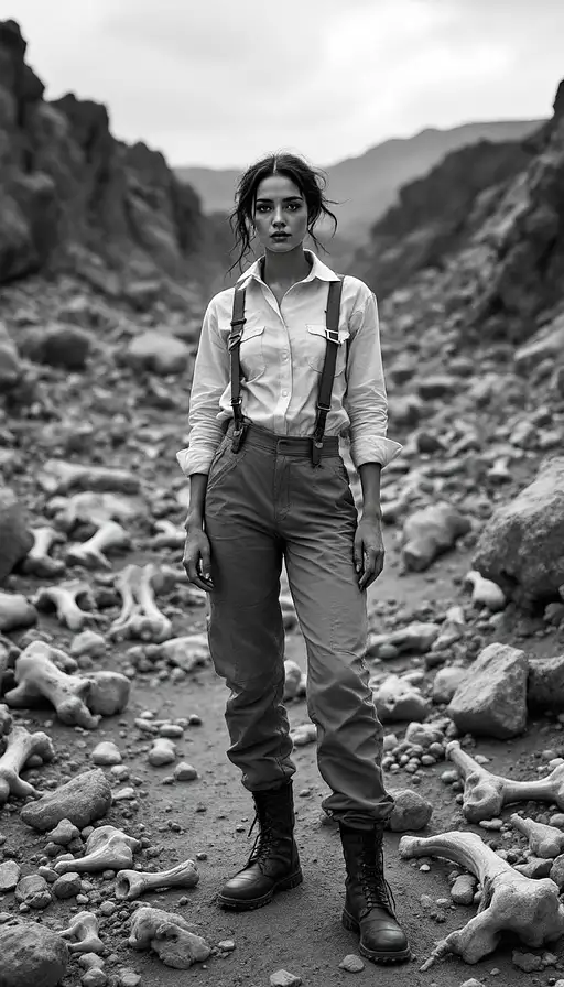 10 months ago (8) A conceptual photography piece, influenced by the stark black and white compositions of Ansel Adams, portrays a female paleontologist standing amidst a desolate, fossil-strewn landscape, her form contrasted against the ancient bones she studies. Her attire is functional and her expression is one of deep contemplation, emphasizing her connection to the past. Photo realism, scientific, timeless, conceptual, earth. Sombrero 0 32