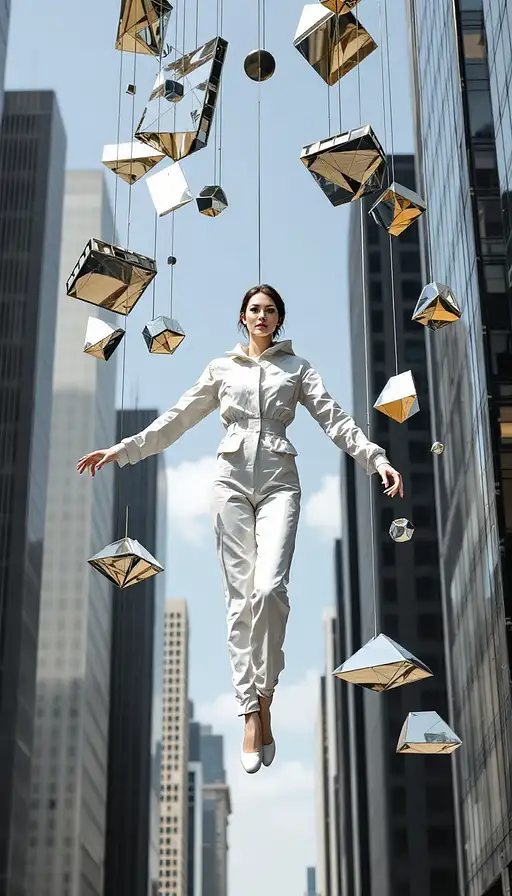 10 months ago (6) A kinetic sculpture, inspired by the moving creations of Alexander Calder, presents a female architect suspended mid-air, surrounded by floating, geometric shapes that mirror the urban structures around her. Her outfit is a minimalist design, and her expression conveys a sense of calm precision amidst the dynamic environment. Conceptual art, architectural, mobile, kinetic, innovative. Sombrero 0 24