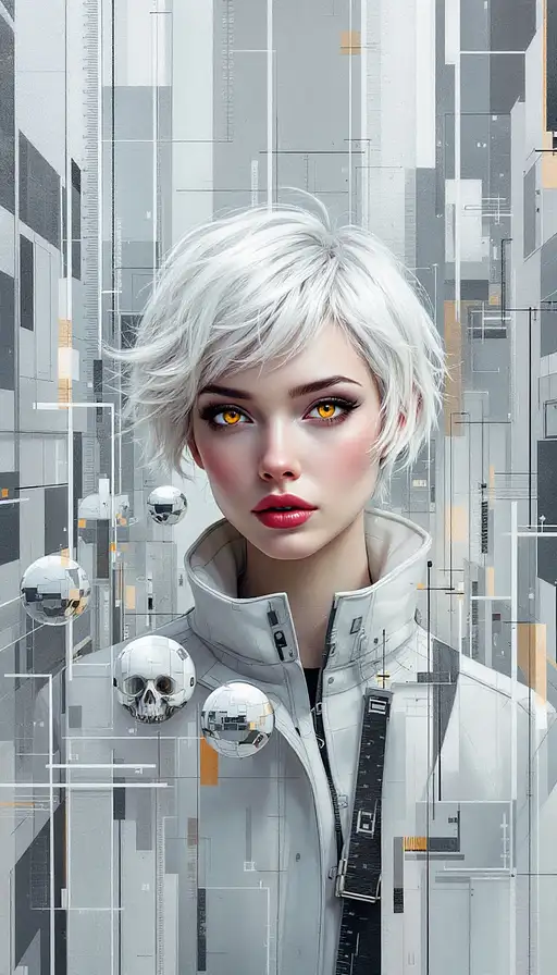 "Crimson Astronomer in a Starry Observatory": A dynamic abstract painting portrays an astronomer, with a blend of intellect and a deep connection to the celestial. She is a skilled student of the stars, shown within a vast observatory where constellations seem to shift and align, with pale skin, short, vibrant crimson hair that seems to echo the colors of distant nebulae, and a practical, flowing robe with cosmic patterns. Telescopes, star charts, and various astronomical tools are woven into her attire and held in her gloved hands. The artwork masterfully combines contemporary art with a character depiction, creating a beautiful and awe-inspiring scene with colors that include reds, purples, and blues. Her focused violet eyes, the focal point of the composition, convey both a sharp mind and a powerful connection to the universe. After a long night spent charting the stars, the astronomer embodies a profound knowledge and an unbridled curiosity. The sharp lines and subtle lighting invite the viewer to explore the hidden narratives within this vibrant artwork, designed as a painting.