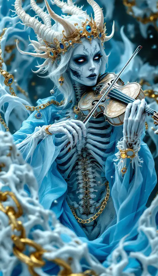 10 months ago "Frozen Requiem: Sapphire Serpentine": A hyper realistic and ultra detailed photorealistic horrorcore picture presents a menacing, yet beautiful female demonic form, a rottencore fractal skeleton, with a flowing icy blue gown and a crown of bone. She is adorned with sacred geometry tattoos that glow with a luminous sapphire light, and is playing a fractalized violin in powerful poses, while the scene is framed in an oblique shot view. Her frame twists and curls while she is entwined with massive golden chains and pocket watches in a mandelbrot fractal set, spiraling and swirling into the frozen abyss in the background. The artwork is created with crystal clear imagery, using ray tracing and global illumination for a richly detailed look, and giving an impression of three-dimensionality to the entire subject. Sombrero 1 25