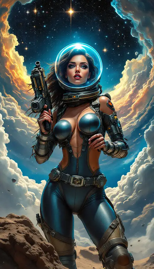 10 months ago A stunning space explorer, designed in a pulp art-influenced style, with a pose inspired by Frazetta. She is shown wearing a form-fitting spacesuit with a large, clear helmet revealing her face, and she is holding a laser rifle, along with a navigation device that appears to glow softly. The background is a cosmic landscape, with a vast field of stars and swirling nebulas. This scene is created as both an impactful poster and a detailed photo. Sombrero 0 62