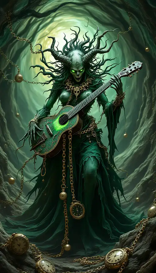 10 months ago "Fractal Fury: Emerald Entanglement": A hyper realistic and ultra detailed photorealistic horrorcore picture shows a fierce and unhinged female demonic entity, a rottencore fractal skeleton, with a long, green tattered gown and a garland of bones around her. She is marked with sacred geometry tattoos that glow with a luminous green, playing a fractalized stringed instrument in powerful poses, and framed in an oblique shot view. Her body contorts and coils while she is bound by large golden chains and with dangling pocket watches in a mandelbrot fractal set, curling and spiraling into a vast abyss. The piece is made with crystal clear imagery, using ray tracing and global illumination for a richly detailed rendering, and applying the illusion of three-dimensionality to the whole theme. Sombrero 0 16