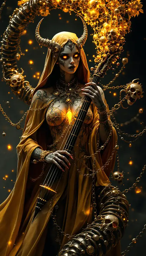 10 months ago "Serpentine Symphony: Amber Ascent": A hyper realistic and ultra detailed photorealistic horrorcore picture portrays a seductive yet unhinged female demonic figure, a rottencore fractal entity, with a long amber hooded garment and ornate skull accessories. She is adorned with sacred geometry tattoos that glow with a luminous yellow, playing a fractalized stringed instrument in a series of dynamic poses, and captured with an oblique shot view. Her frame twists and contorts while she is wrapped in massive golden chains with attached pocket watches in a mandelbrot fractal set, spiraling and swirling upwards. The image is presented with crystal clear imagery, using ray tracing and global illumination for richly detailed layers and a feeling of three-dimensionality throughout. Sombrero 0 21