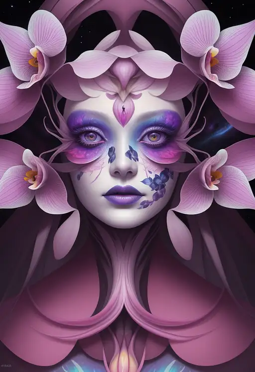 2 years ago floral, prismatic sinister, symmetrical, beautiful woman painted-face, fantasy, oil on canvas, color, palette, 8k, hyper-realistic, orchid galactic aura Sweetyroo11 0 59
