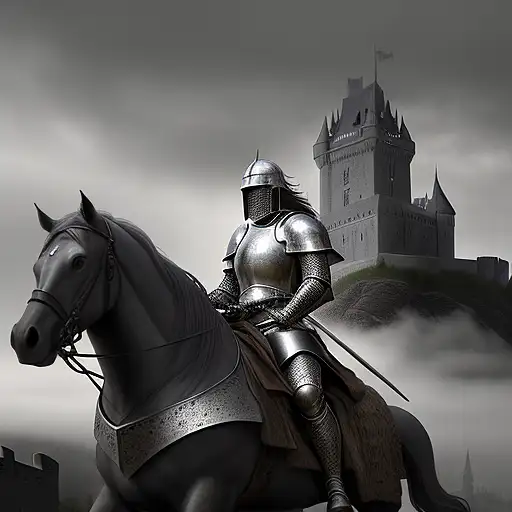 almost 2 years ago Take on the Middle Ages! Focus on knights, castles. Depict a knight riding a horse, armed with armor, swords and shields. The background is gloomy, gray. In the background, a castle on a hill, consisting of a defensive tower and defensive walls. Gothic style religious architecture. fog Sylwiakolo 0 72