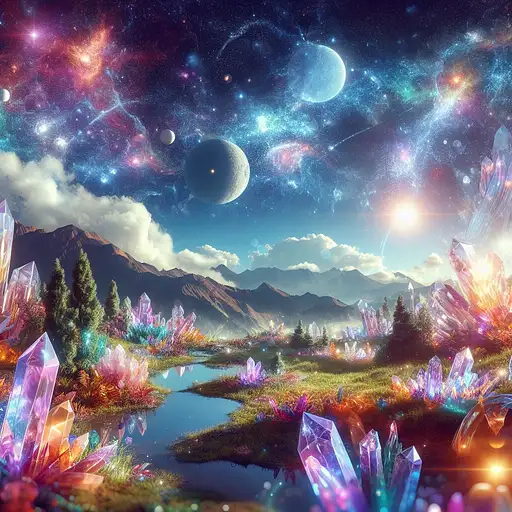 2 years ago a world made of crystals, of all colors, the landscape as well as the plants and animals are made of crystals, a beautiful picture, the sky is full of stars and nebulae and planet, lensflare, dynamic light, there is ground fog and a lake Duffman 2 130
