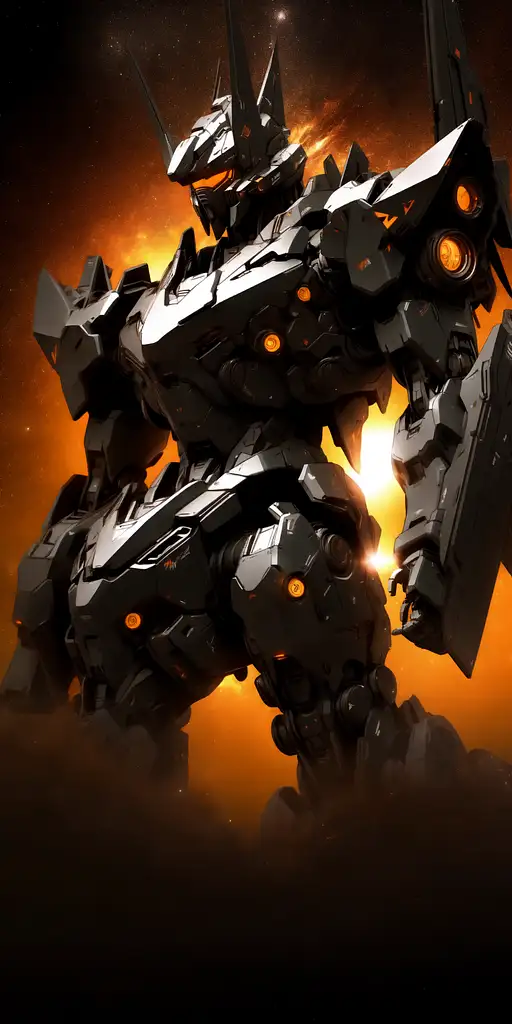 11 months ago giant mecha robot in the galaxy in defense mode with futuristic armors and wapons, the galaxy have to be orange black with stars and the color of the armor in contrast, epic background <lora:mechaDream-v1_lora:1> Tears 1 150