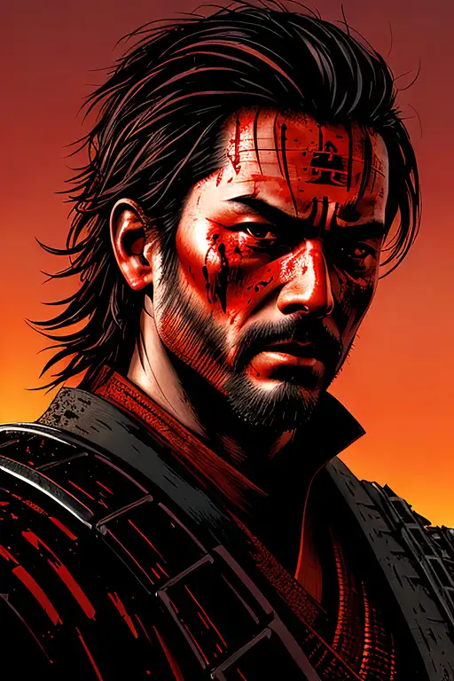 almost 2 years ago A portrait of a samurai, Miyamoto Musashi, short messy hair, visible battle scars, blood splatter, empty expression, traditional black and red samurai attire, facial hair, grunge sunset background, highly detailed, masterpiece, comic style ThorosThor 5 220