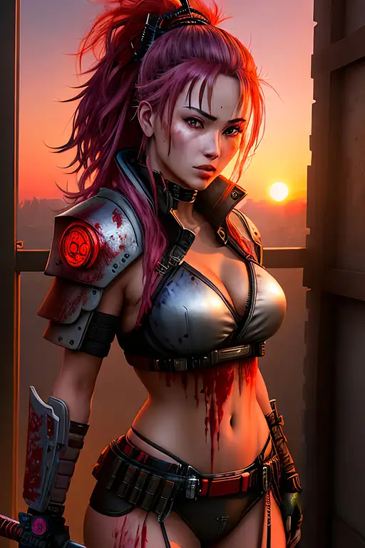 almost 2 years ago A highly detailed portrait of a female samurai ronin cyberpunk against a red sunset background, action pose, grunge, well lit, bright vivid, ultra realistic, highest resolution quality, masterpiece, digital art, 4k ThorosThor 1 33