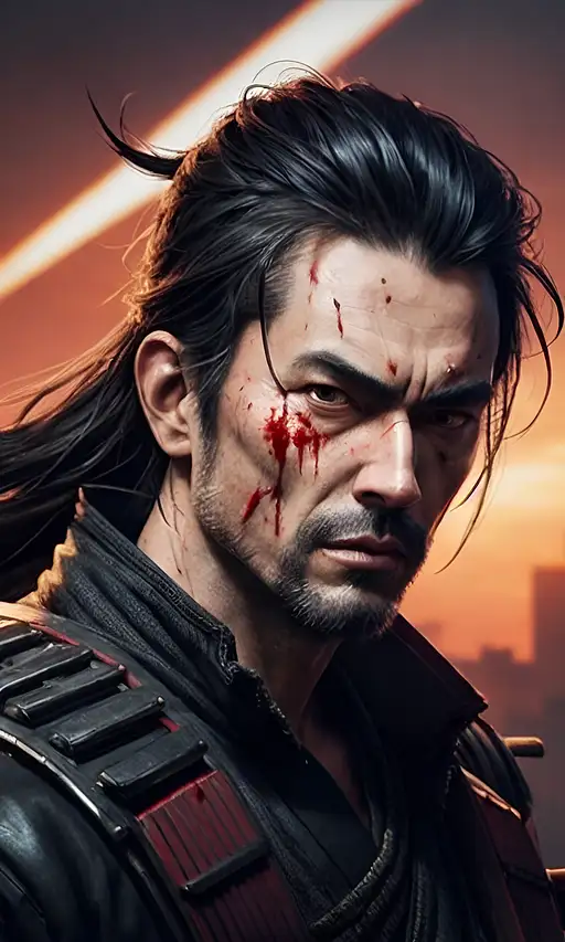 almost 2 years ago A photo portrait of a male samurai, in a Kurosawa Akira art style, traditional samurai armor attire, dark sunset in background, visible battle scars, blood splatter, highly detailed, in focus, photorealism, photo realistic raw format ThorosThor 2 150