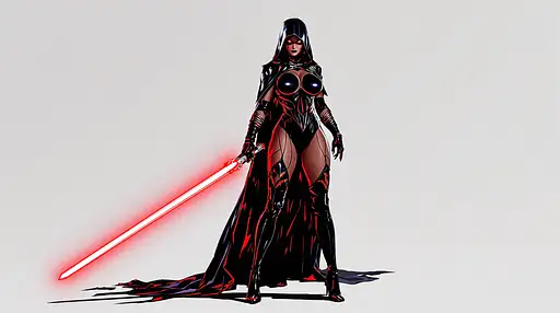 9 months ago Woman, tall, voluptuous, full breasts, Sith lord, sexy one piece black leotard, black stiletto boots up to the knees, red glowing eyes, she stands ready to attack with a red light saber in both hands, black cloak, hood down, angry, extreme wide full body view from head to toe, casts shadow, transparent background Tikiman3d 0 30