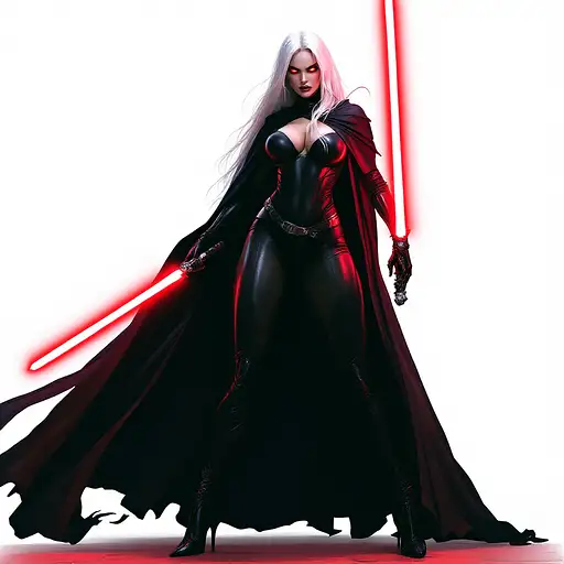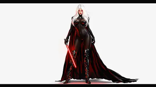 9 months ago Woman, tall, voluptuous, long white hair, Sith lord, one piece black leotard, black stiletto boots up to the knees, red glowing eyes, she stands ready to attack with a red light saber in her left hand, black cape, angry, grits teeth, extreme wide full body view from head to toe, casts shadow, transparent background Tikiman3d 0 33