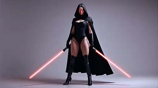 9 months ago Woman, tall, voluptuous, full breasts, Sith lord, one piece black leotard, black stiletto boots up to the knees, red glowing eyes, she stands ready to attack with a red light saber in both hands, black cape, angry, extreme wide full body view from head to toe, casts shadow, transparent background Tikiman3d 0 12