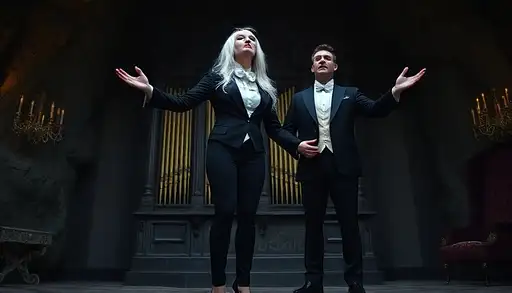 9 months ago Woman, tall, voluptuous, long white hair, phantom of the opera, right side of face is severely disfigured by fire, she wears a fitted tuxedo, Black suit with white shirt and white bow tie, she wears 4" black stilettos, she sings in an operatic style, arms wide, in a gothic lair , cave with a large pipe organ. extreme wide to show entire body. A handsome man in nineteenth century formal wear stands ten feet behind her mesmerized by her singing. Tikiman3d 0 15