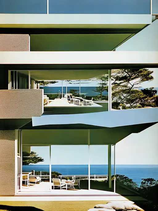 2 years ago Hyper realistic eye level exterior photo of a mid century modern style house overlooking the ocean, daylight, indirect lighting, AD magazine, Frank Lloyd, Eames, Mies van der Rohe Tiloup1963 0 72