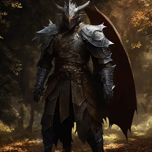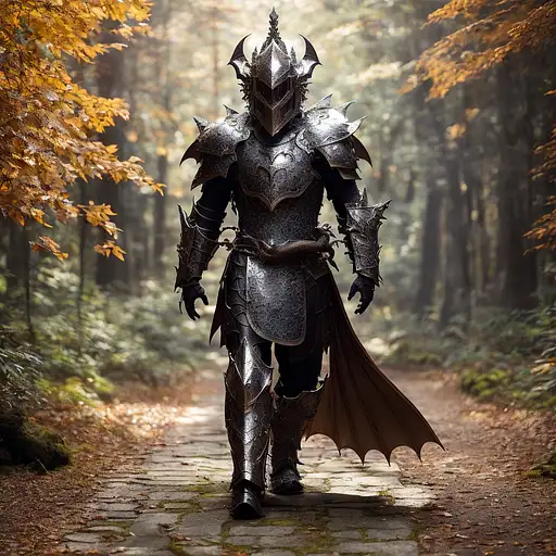 over 2 years ago a (dragon:1.2) paladin in plate armor (intricately detailed metal) walking through a forest, godrays through trees, autumn leaves, dnd character, 8k, masterpiece, hyperrealistic, depth of field, full body portrait, solo, realistic, detailed scales Verinax 1 180