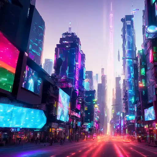 over 2 years ago first person view on a street of a (futuristic cityscape) with holographic advertisements that show a variety of new technology, 8K, hyperrealistic, glowing lights, future, sci-fi, science fiction Verinax 1 58