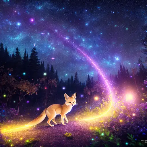 over 2 years ago A single (fennec fox:1.1) with (detailed fur) (running:1.2) through an (enchanted forest:0.6) next to a (river:0.7),((vibrant)), particles, motion blur, detailed eyes, hyperrealistic, HDR, 8k, sharp focus, highly detailed, by Stanley Artgerm Lau, artstation, light particles, pixies in the background with (stars and galaxies) floating Verinax 1 110